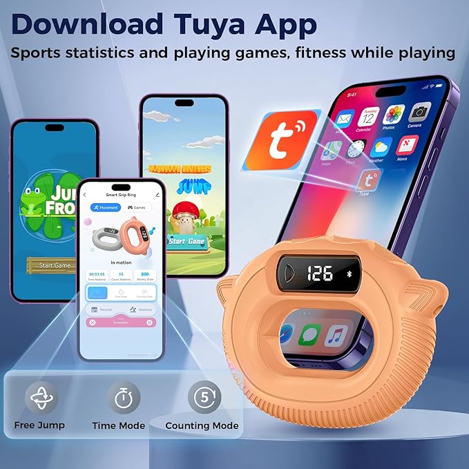 - Intelligent App without Ads- Gorifei gripsner can be connected to the mobile app via Bluetooth for use. The app, named tuya, is accessible on both iOS and Android systems. Once connected, you can pick from 3 training modes available in the app. 1. Free Jump: Train freely without any time or grip frequency restrictions. 2. Time Mode: Set a defined period for your hand grip training. 3. Counting Mode: Determine a goal the number of grips you aim to achieve. When you begin your training, the grip count shown on the Gripsner screen will be automatically synced to the app.