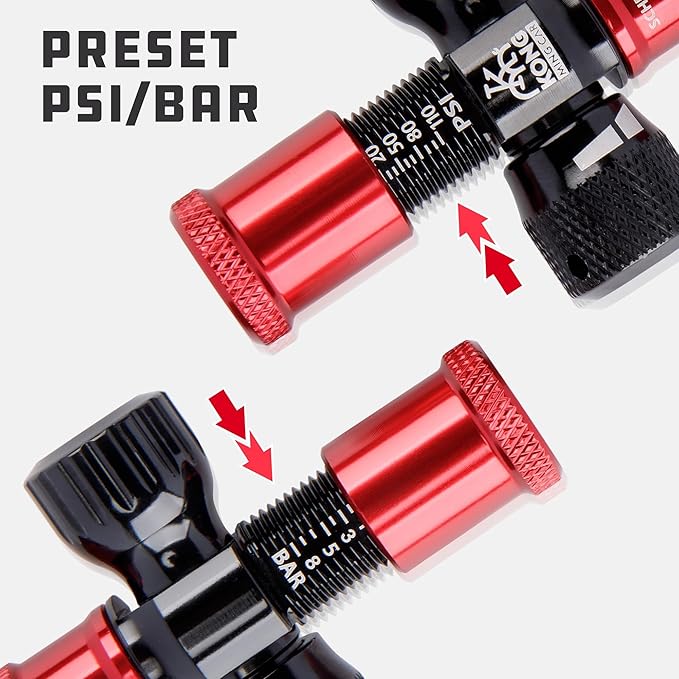 - 【GET BACK RIDING QUICKLY】 – Whether you're on the road or trail, repairing a flat, or preparing for your next ride - the PRE-Set CO2 inflator kit offers the most reliable way to rapidly inflate your bike tires anywhere, anytime,Set-up the pressure valve, press onto the tube valve. If tire is over-pressured, the inflator will automatically leak the air to the right value. On the opposite, if no leaking, further inflation will need.
