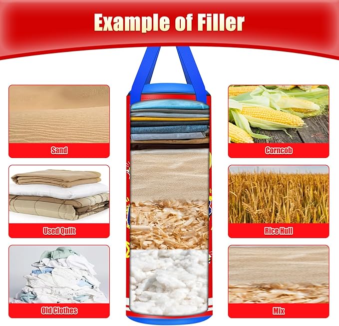 - Boxing Equipment for Kids: The 2ft unfilled boxing bag for kids is easy to carry and store. You can fill it with sand, old cloth, sawdust, shredded cotton fabric, soybean, corn, sponge and so on. But please don't just fill it with sand, the filler should preferably be no more than 44lbs.