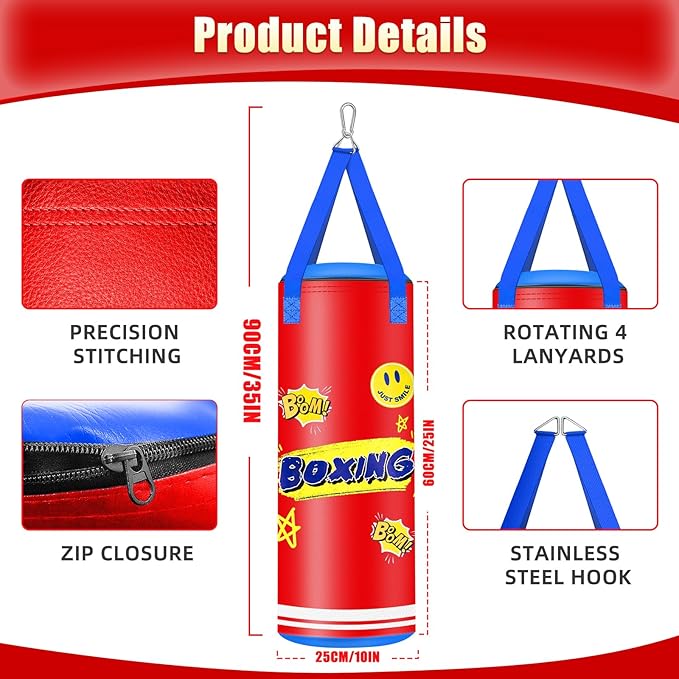 - Ideal Kids Boxing Gift: This punching bag for kids 8-12 can training tawekwondo, karate, kicking, helps children improve strength and power, practice reflexes and hand-eye coordination, build up cardiovascular endurance, improve coordination and reduce stress.