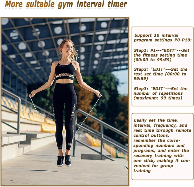 - The interval timer has timer programming function, which can save up to 10 custom programs. The interval clock P0-P10 has 9 custom intervals each (from F1 MM: SS C1 MM: SS to F9 MM: SS C9 MM: SS), and can support up to 99 rounds. You can set the time, interval, frequency, and rest time according to your needs, remember the corresponding numbers and programs, and enter the recovery training with just one click, making it convenient for group training. 10/3Sec can be turned on/off for 10 seconds/3 seconds preparation time