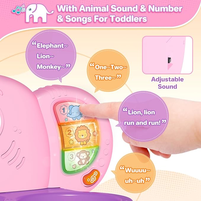 - 【Lights & 30+ Sounds & Songs】Our 2-IN-1 toddlers toy can make a variety of sounds, there are realistic animal calls, number, 30+ lovely music, soothing sleep songs,children can hear the music cheers when he score a goal. With lights, elephant's trunk & music button give off seven colors of light. The volume of this playset is adjustable, the soft music and lights can also accompany toddlers to sleep.