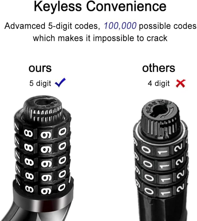- SECURE & RESETTABLE: NDakter bike locks with 5.6FT long cable (distance between ends of lock), and this bike lock is 5-digit resettable combination cable bike lock, much safer than other 4 digit bicycle lock. Easy to set your own personalized number combination.(Safety tip: Please do not leave your bike out of your sight for too long, especially in high crime areas.)