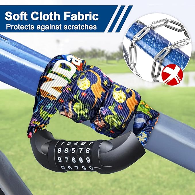 - SCRATCH-PROOF FABRIC PROTECTION: The bicycle chain lock is wrapped by a high quality polypropylene fabric, which is scratch-proof and wear-resistant, anti-hot and anti-icing hands; it protects the chain and prevents it scratching your bicycle frame, long lifespan.