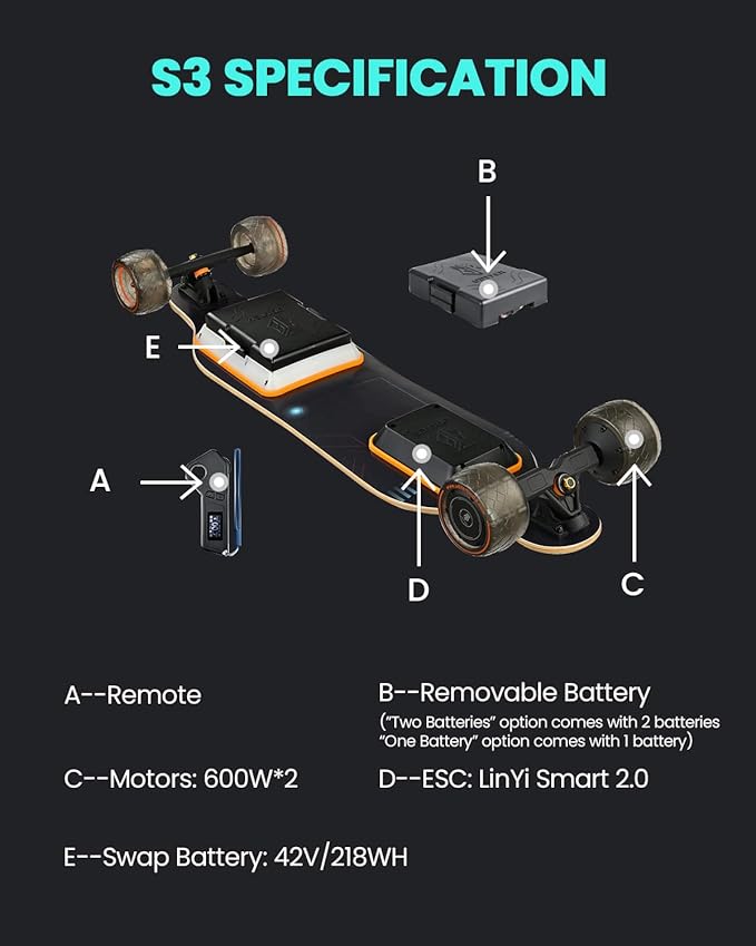 S3/Pixel Rider Electric Skateboards with Remote and Swappable Battery/Top Speed 28 Mph/2 * 600W Motors/12Miles/25Miles Max Range Electric Longboards for Adult&Beginner