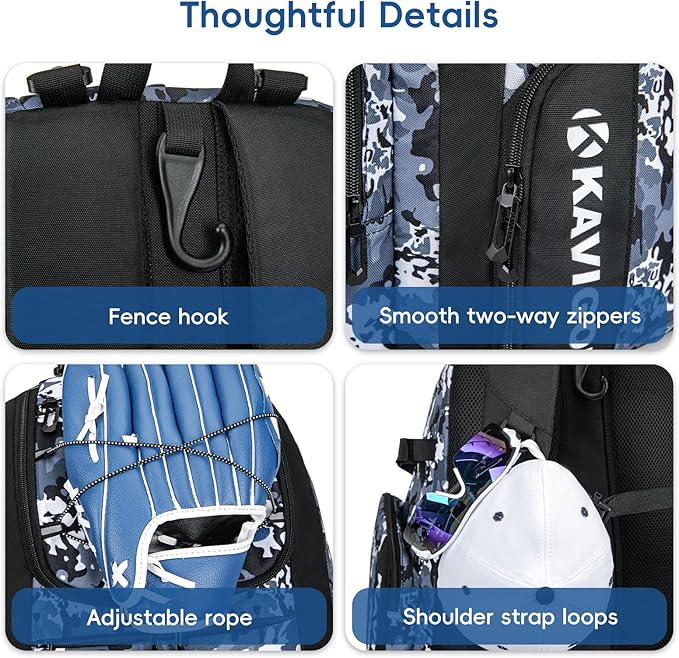 - Durable Materials: Made from tear-resistant 900D Oxford cloth with sponge padding, this adult baseball backpack is built to last and is waterproof. The custom KAVIGOR zippers are thoroughly tested to ensure long-lasting reliability