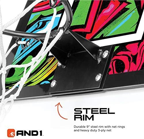 - Spring Loaded: The AND1 basketball hoop door comes with a 9” durable break-away steel rim that bounces back into position and includes a heavy duty 3-ply net.
