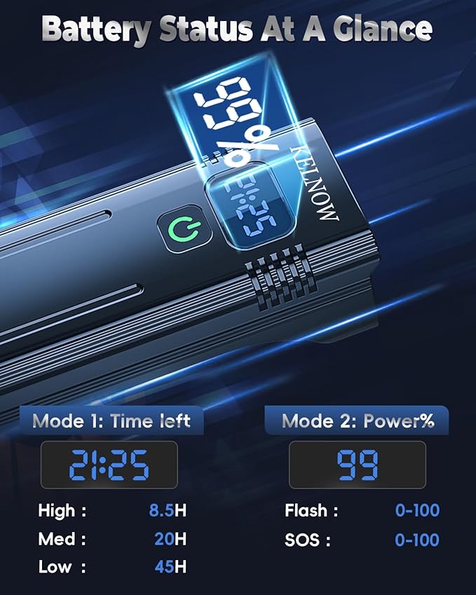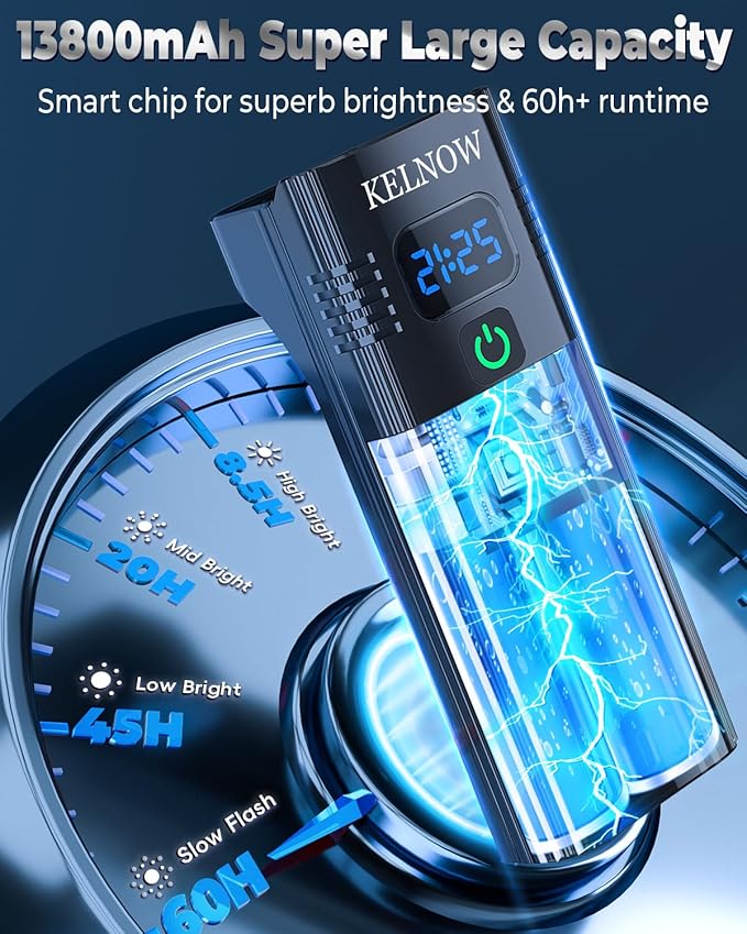 - [13800mAh Large Capacity & 60H Runtime Headllight] The KELNOW bike headlight features with a 13800mAh high capacity battery for up to 60 hours runtime, so you don't have to worry about running out of illumination halfway through your night ride. With the LCD digital display of the bicycle headlight, you can keep track of the remaining power and charge your lights in time.