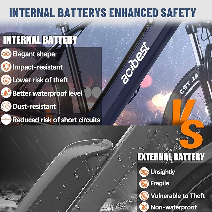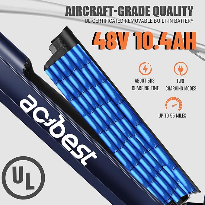 - 48V 10.4AH Removable Built-in Battery - The UL2849-certificated battery is easy to remove for charging and has a waterproof, shockproof and anti-theft design, which is safer and lasts much longer. The battery only takes 4-6 hours to fully charge, giving you a range of up to 35 miles (throttle)/55 miles (PAS) on a single charge.