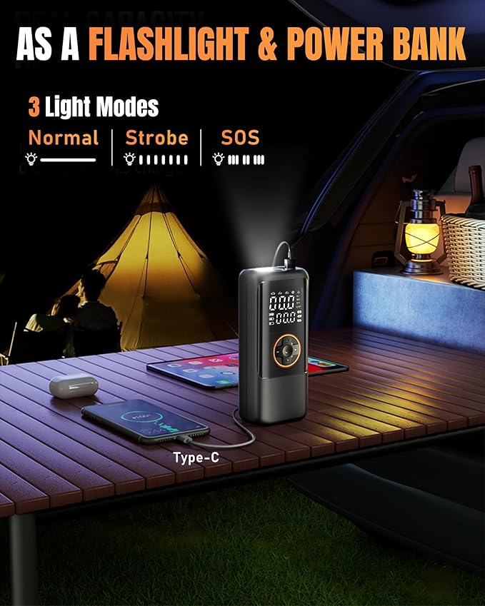 - 【Multi-functional Use】This Portable Air Pump Is Not Only For Inflating But Also Serves As A Power Bank. With A Built-In Usb-C Port, It Can Supply Power To Mobile Phones And Other Electronic Devices. Moreover, Its 3 LED Lights Offer Bright Lighting Or Strobing For Night Activities Or Emergencies. It Is An Excellent Christmas/Birthday/Festival Gift For Family And Friends.