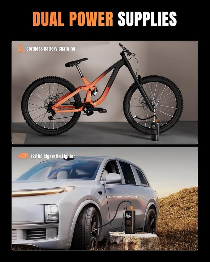 - 【4X &150PSI】 Cordless Bike Pump With Tire Pressure Gauge Is Equipped With A High-Performance Chip, Offering 150 Psi Air Pressure. In Less Than 1 Minute, It Can Quickly Increase Tire Pressure From 29 Psi To 36 Psi. With Lightning Speed, This Tire Pump Easily Handles Various Inflation Challenges.