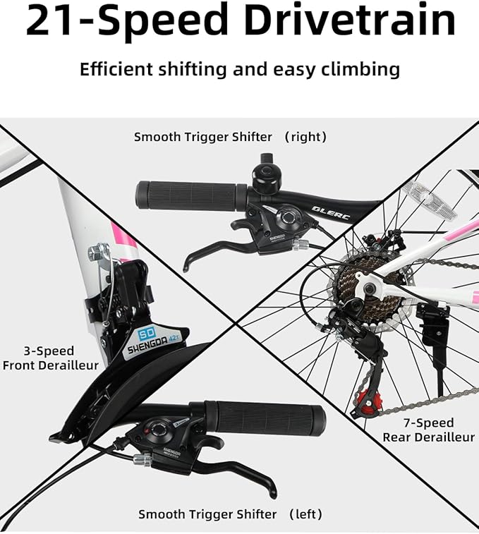- 【Ride Anytime】This mountain bike is equipped with a 21-speed drivetrain, offering versatile speed options to tackle diverse terrains, while its smooth and efficient gear shifting further elevates the riding experience.
