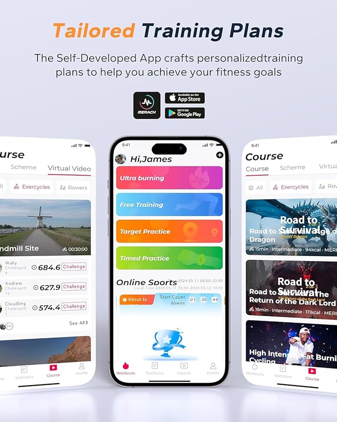 - WHY MERACH: We have self-developed MERACH APP, you will use it for free forever after the Exercise Bike and APP are bound! Our fitness trainers can work out with you online and give you professional guidance to increase your fat burning effect by 30%! A large number of real-life experience, simulation of crossing the Swiss snow, Alpine challenge, coastline riding and so on, make the boring exercise more interesting and exciting