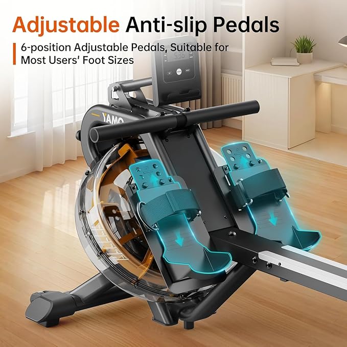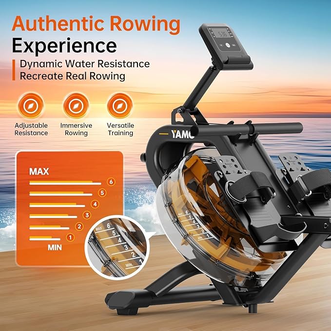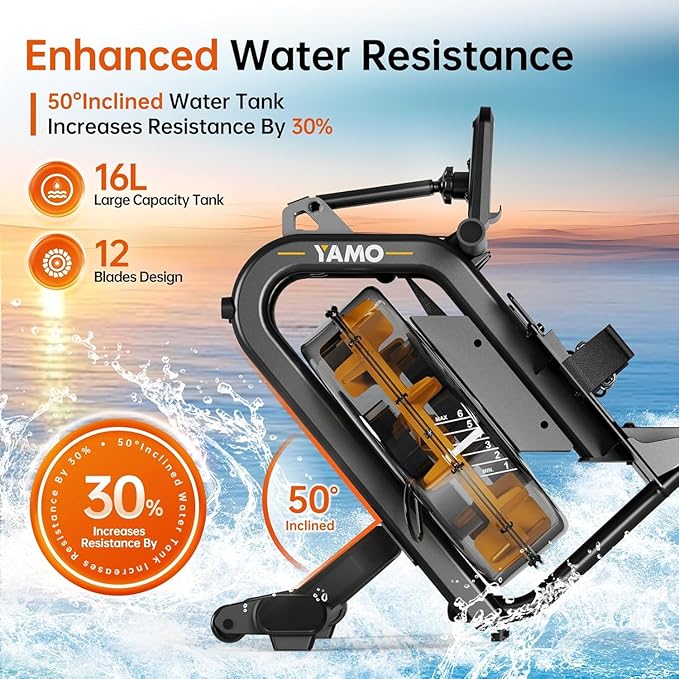 - 【Innovative Inclined Tank Design】YAMO Immersive water rowing machine, features an inclined tank design, which not only provides greater resistance than traditional flat tank rowing machines, but also allows you to feel more layered resistance changes during rowing, much like in real natural waters