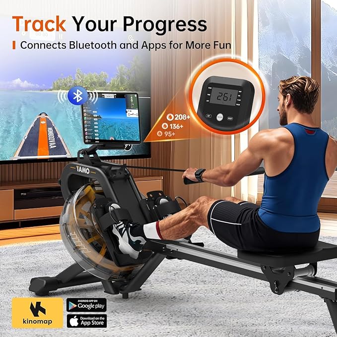 - 【Bluetooth Connection & APP Support】YAMO Rowing Machine connects to smart apps via Bluetooth. With this feature, you can track your training data, experience realistic rowing scenarios, and participate in online competitions. This integration makes your rowing workouts more efficient and enjoyable