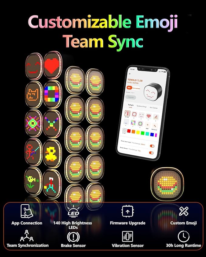 - Be Unique and Fun:The TL08 tail light allows you to customize your ride with fun patterns using a simple app. Choose from a variety of designs to express your personality. Whether you want to show a smiley face or a cool sunglasses emoji, it makes your bike stand out and adds excitement to every ride with friends