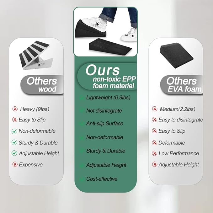 - ※ DETAILS MAKE THE DIFFERENCE : Slant Board for Calf Stretching uses EPP environmentally friendly materials that are non-toxic, odorless, waterproof, and oil-proof, 100% recyclable, and almost no performance degradation.foam wedge can withstand 440 lbs.compared with the slant board on the market, our products have the advantages of light weight and easy storage. they can be moved to every place in the house at will and can be reused many times.