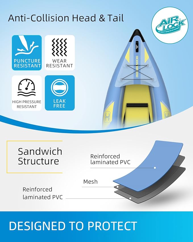 - 【Protected Journey】Built with durable vinyl materials with an drop-stitch floor to increase rigidity that withstands the unexpected outdoor elements. 3-chamber constracter add extra safety. Halkey-Roberts valves can withstand better pressure, easy to use and leak-free. Multiple safeguards to help you kayak safely.