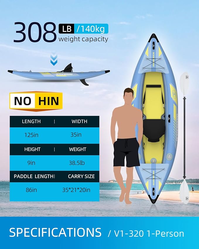 - 【V320 1-PERSON】Inflated size is 10.5 x 2.95 x 0.79 feet with a weight capacity of 308 pounds and easily foldable to be put in the carry bag that allows for easy transportation. Made of heavy duty vinyl, the kayak will be with you longer.