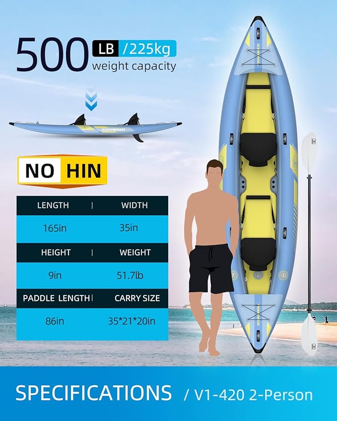 - 【V420 2-PERSON】Inflated size is 13.7 x 2.95 x 0.79 feet with a weight capacity of 308 pounds and easily foldable to be put in the carry bag that allows for easy transportation. Made of heavy duty vinyl, the kayak will be with you longer.