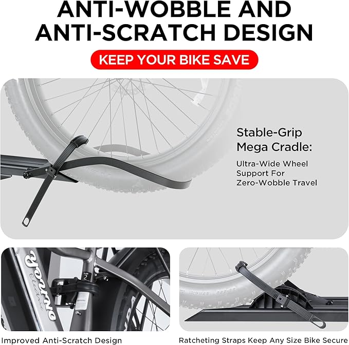 - SAFE AND SECURE ON OFFROAD: Comes with 2-arm fix, Anti-falloff 360° swirl structure and anti-wobble structure, that secure your E-bikes in place without swaying and knocking against vehicle.