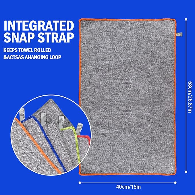 - ULTRA COMPACT, LIGHTWEIGHT, STAY CLEAN WITH HANGING LOOP: With an integrated snap strap closure that doubles as a hanging loop over the door, your backpack, or bottle. the large thin towel rolls up into a packable travel-friendly size. Perfect for anyone who travels light.
