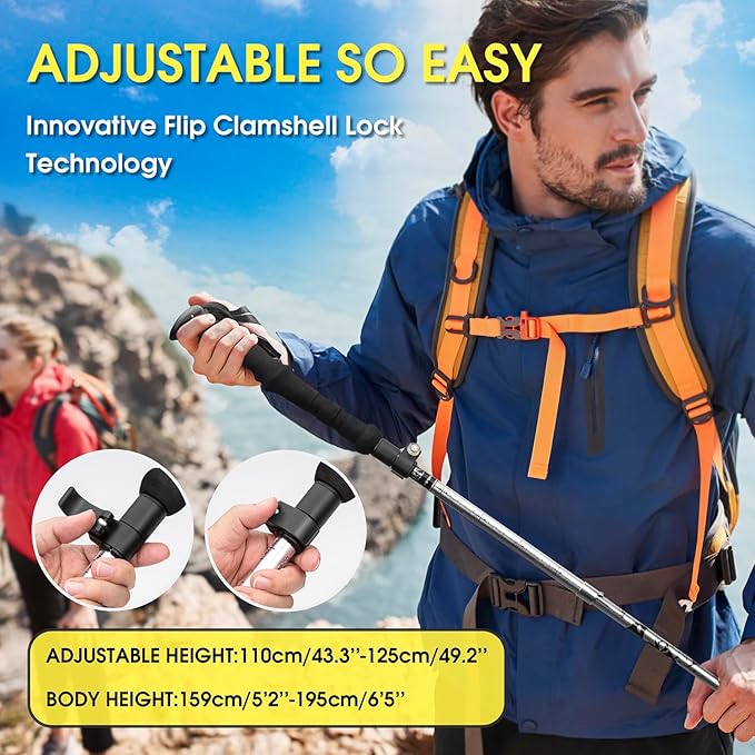 - Precision Adjustment System: Our lightweight folding hiking stick features an intuitive clamshell locking system and telescoping mechanism, enabling effortless length adjustments between 110cm (43") and 125cm (49").Choose the perfect size: 110-125cm for users from 5'2'' to 6'2''.The walking pole adapts seamlessly to diverse terrains—whether tackling steep ascents, rocky trails, or uneven paths.
