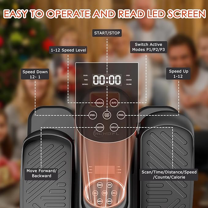- AUTO & MANUAL MODES: Unlike traditional foot pedal exercise machine, the RCHDFL elliptical training machine designed for seated use has both manual (12 speed levels) and automatic (P1-P3) modes for you to choose from. The pedals can go forward or backward to target different muscles. The LED display monitors data, records time, speed, distance, and calorie burned in real-time.