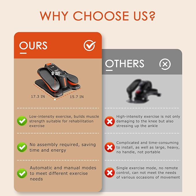- LOW IMPACT ELLIPTICALL TRAINER: The RCHDFL Low-intensity exercise elliptical provides a workout with less impact on the joints and is perfectly suited for seniors and leg rehabilitation populations who want to exercise their legs while sitting. The mini elliptical with low-impact burns calories, improves cardiovascular health, builds muscle strength and helps legs recover quickly.