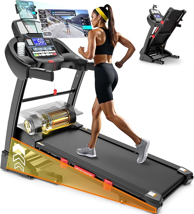 - 【SMART APP CONNECTION & IMMERSIVE WORKOUTS】 Connect your folding treadmill to the dedicated app for a more engaging workout experience. Enjoy virtual scenery that makes each run feel like an adventure, while the built-in speakers deliver your favorite music or coaching audio. Perfect for motivating and immersive home training.