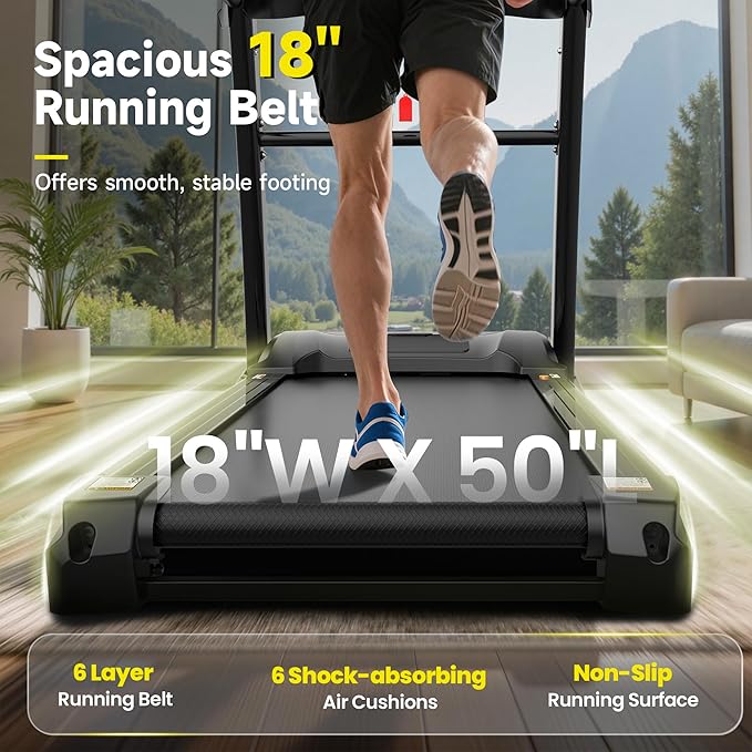 - 【SPACIOUS SHOCK ABSORPTION DECK】Designed with an 18'' x 50'' running surface, this treadmill with incline gives you plenty of room to walk, jog, or run comfortably, while 6 built-in shock absorbers and a 2-layer high-elasticity non-slip running board provide excellent cushioning and stability to protect your joints.