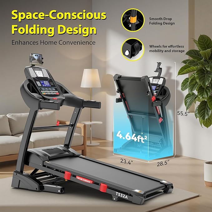 - 【SPACE-SAVING EASY FOLD DESIGN】This treadmill for home features a convenient soft-drop folding system for safe folding and unfolding without strain. With built-in wheels, it’s easy to move and store. The folded size is just 28.5"W x 23.4"L x 55.5"H, making it ideal for compact spaces like apartments, offices, or small home gyms.