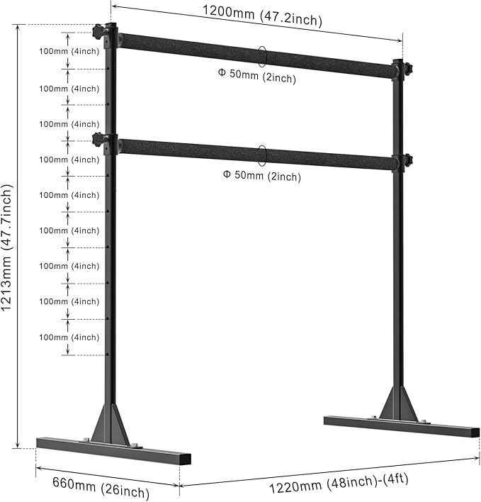 - 【Spacious Design】The ballet barre measures 48" (4 FT) in length, 48" (4 FT) in height, with a crossbar diameter of 2", providing ample space for a full range of motion exercises.