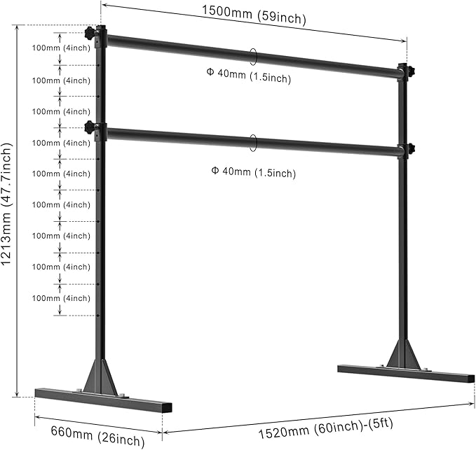 - 【Spacious Design】The ballet barre measures 60" (5 FT) in length, 48" (4 FT) in height, with a crossbar diameter of 1.5", providing ample space for a full range of motion exercises.