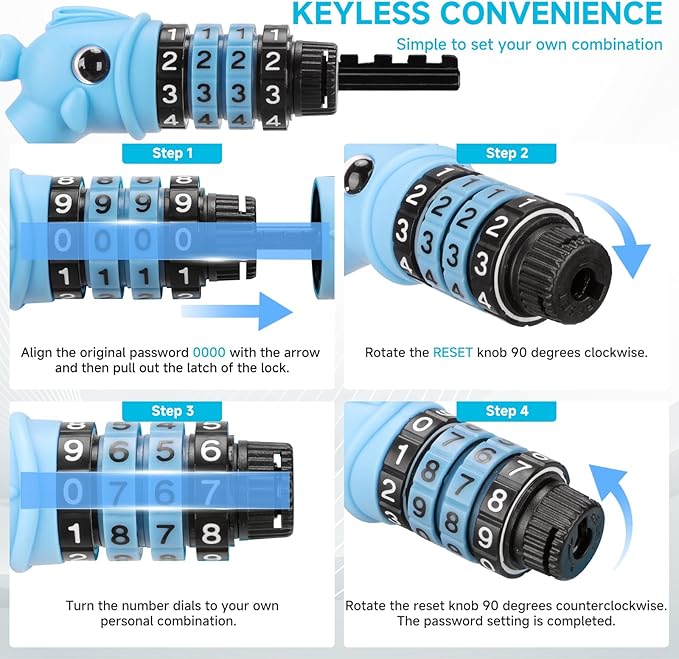 - Easy-to-Set Combination: The resettable four-digit password bicycle cable lock allows you to set a personalized password, enjoying keyless convenience without worrying about lost or stolen keys. It comes with a free mounting bracket for easy portability. After setting the password, it is recommended to record it or tell your relatives to prevent forgetting.