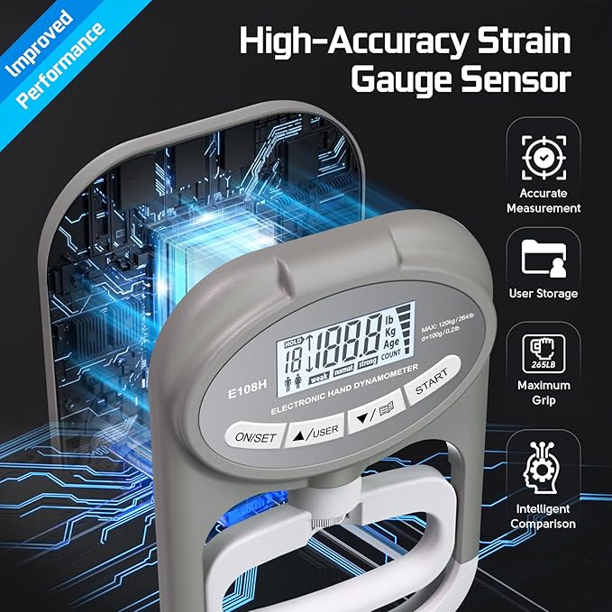 - šš«š¢š© ššš«šš§š šš” šš«šš¢š§šš« šššš¬š®š«šš¦šš§š: Grip strength tester measuring up to 265 lbs (120 kg) in 0.2 lbs (0.1 kg) increments. The grip trainer offers real-time readings that help you monitor your strength gains effectively