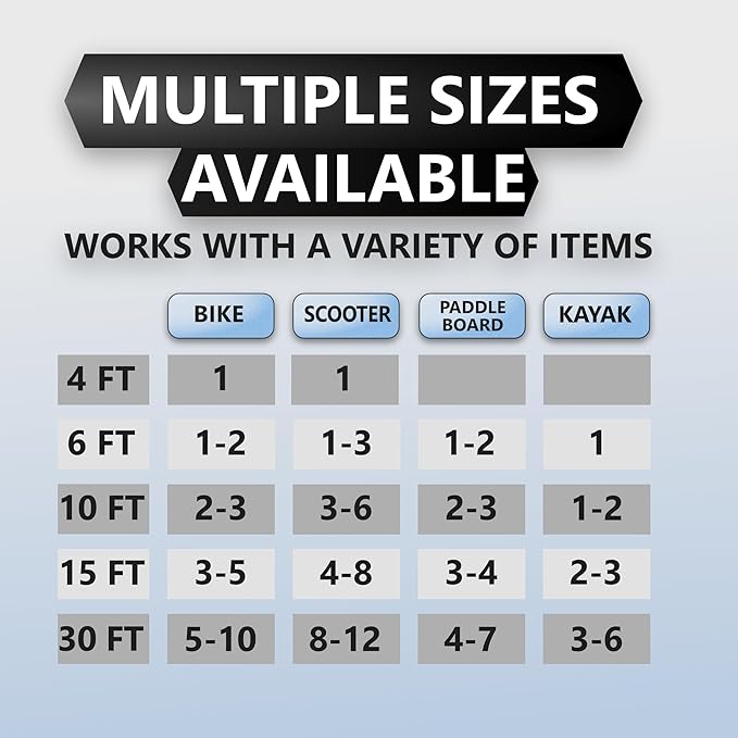 - Versatile - Ideal for securing a variety of items, including bikes, kayaks, paddleboards, scooters, gates, skateboards, motorcycles, lawnmowers, grills, patio furniture, sports equipment, tool boxes, ladders, doors, and more.
