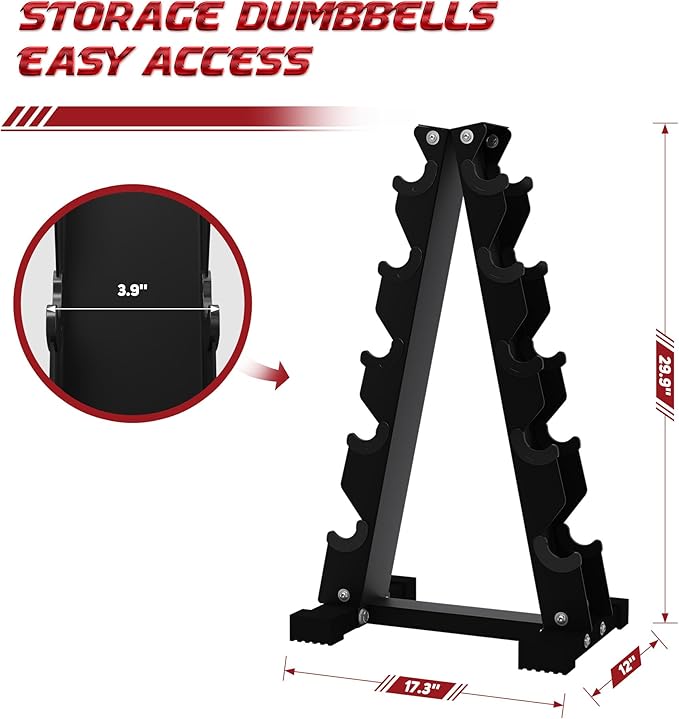 - Versatile Home Gym Solution: This set includes a 5-tier A-Frame stand to neatly and conveniently store the 150 lb set of 5 paired dumbbells ranging from 5 to 25 lbs.