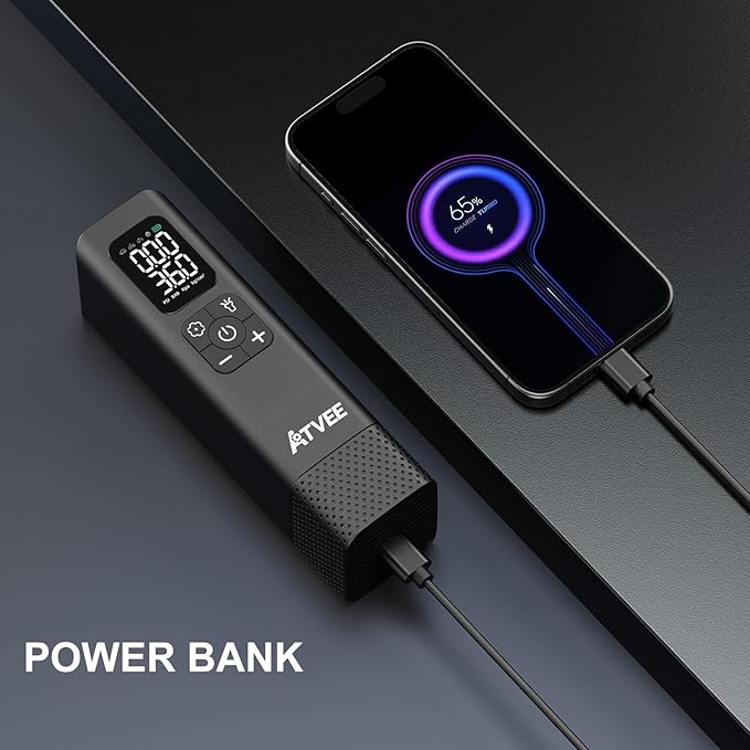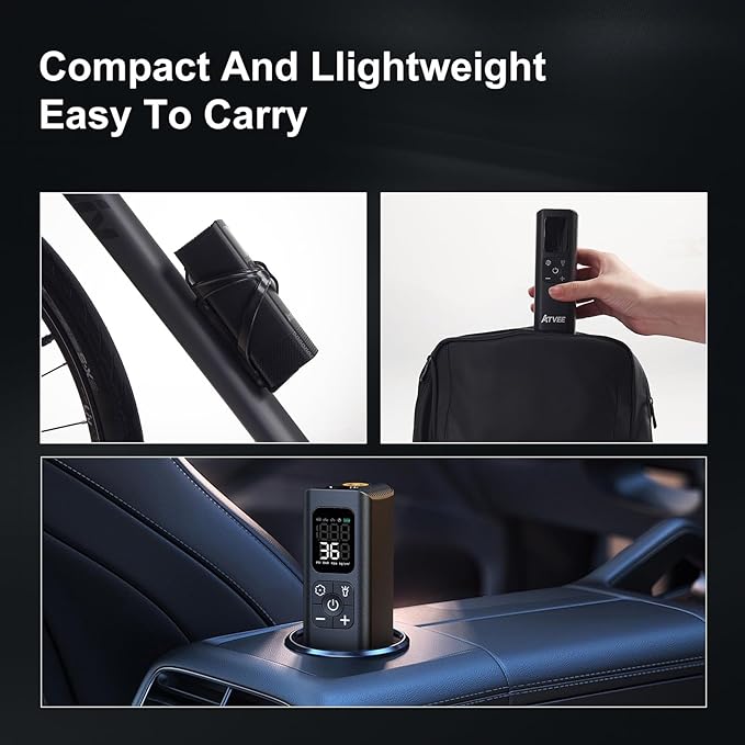 - 🔋Rechargeable & Cordless Design This bike air pump features a built-in 12V lithium battery and USB-C charging. No external power source required—perfect bike pumps for use anytime, anywhere.