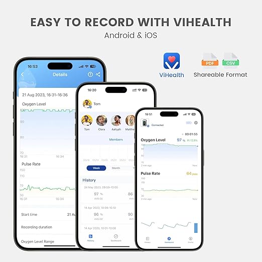 - Easy to Record: You can browse the latest 12 sets of data on the oximeter, and view real-time data, graphical reports, O2 readings and heart rate trends on the Vihealth APP