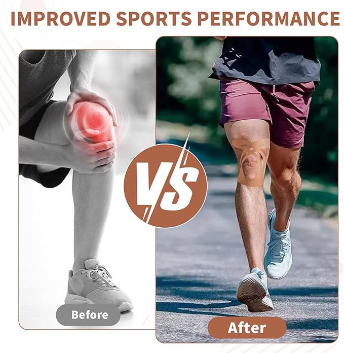 - Breathable, Waterproof & Skin-Friendly - Knee tape for knee pain relief pre cut is made from latex-free, breathable cotton with an acrylic adhesive, this kinesiology tape is gentle on all skin types, and the waterproof material withstands sweat and water