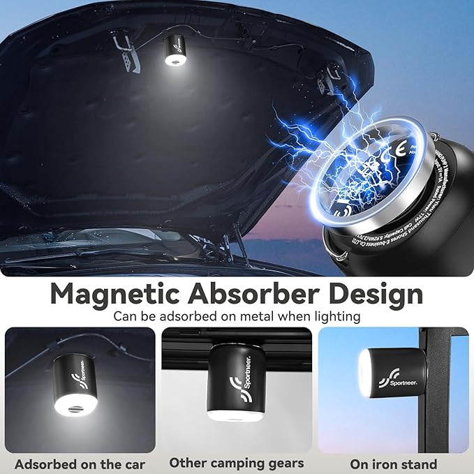 - Hook & Magnetic Base Design – Sportneer rechargeable air pump features a hidden hook and strong magnetic base, allowing you to hang the pump inside a tent or attach it to any metal surface for convenient hands-free use.