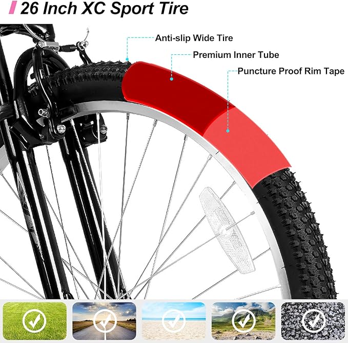 - Sporty and Safe: Dual V-brakes provide excellent stopping power, making your rides safer; The all-terrain XC sport tires are designed for rugged roads, ensuring a non-slip and explosion-proof performance