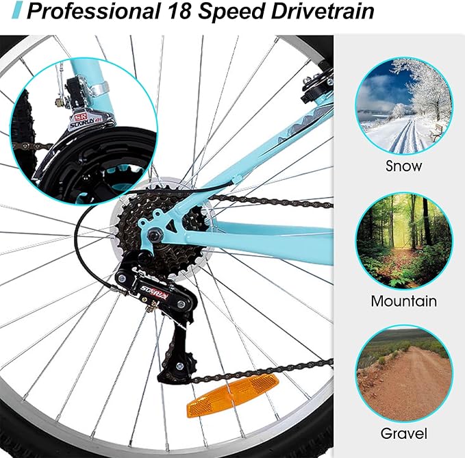 - 18-Speed Drivetrain: With 18 speeds at your disposal, you have precise control over your biking experience; Tackle any incline or hill with ease and enjoy a smooth ride, whether you're an experienced rider or a beginner