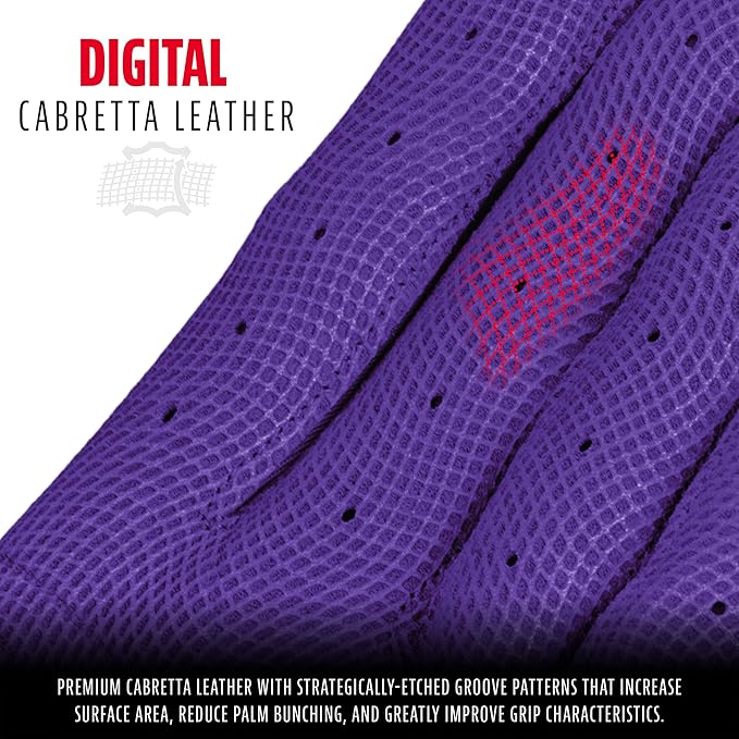 - DIGITAL LEATHER: Constructed from premium digital leather with strategically-etched groove patterns that increase surface area, reduce palm bunching, and greatly improve grip characteristics