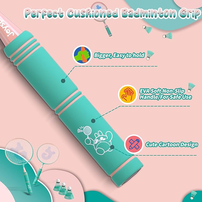 • 【Perfect for Beginners】 Ideal for young players who are just starting to learn badminton, this set includes colorful nylon stringing that catches kids' attention. The round-shaped racket head helps them make contact with the shuttlecock more easily. The T-shaped reinforced joint strengthens the connector and prevents damage, ensuring a longer lifespan for the rackets