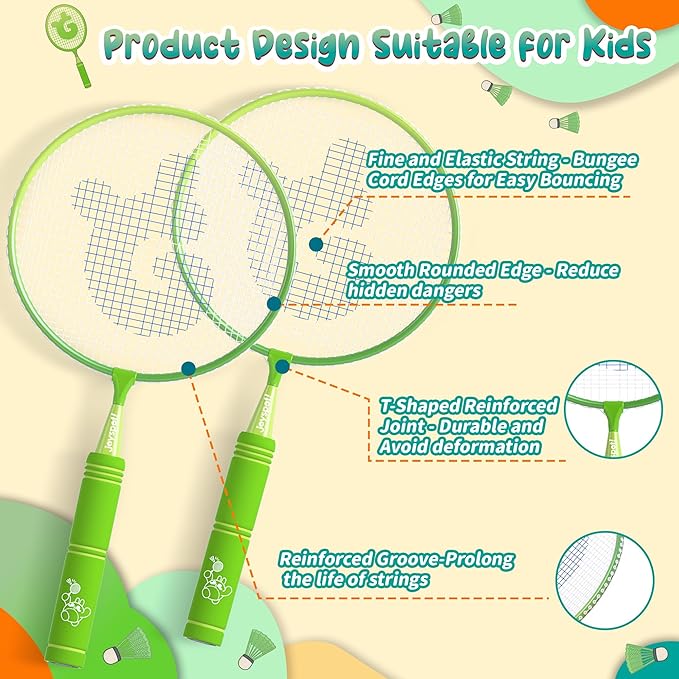 - 【Perfect for Beginners】 Ideal for young players who are just starting to learn badminton, this set includes colorful nylon stringing that catches kids' attention. The round-shaped racket head helps them make contact with the shuttlecock more easily. The T-shaped reinforced joint strengthens the connector and prevents damage, ensuring a longer lifespan for the rackets