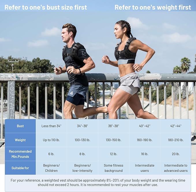 - Tailored Weight Options: Available in various weights tailored for all users,6lb/8lb/12lb/16lb/20lb weighted vest ensures even weight distribution to reduce fatigue, making your training sessions more effective.
