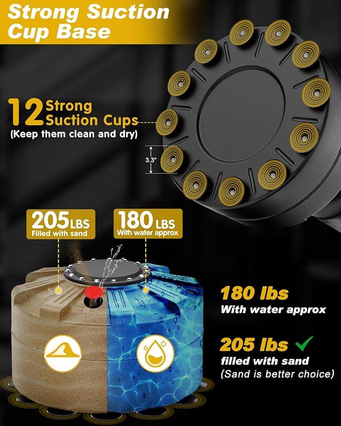 - Stable Floor Sucking Base - Rounded ABS tank base for easy rolling relocation. Includes 12 strong suction cups beneath to stop base movement. Filled with sand or water, sand proves more stable.