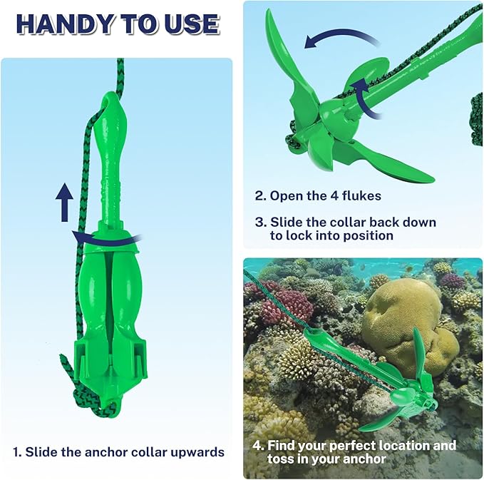 - 【SIMPLE FUNCTION】No installation required. Just slide up the grappling anchor, open 4 flukes, slide the anchor ring back and lock it in position. Use as much anchor rope as possible to create better horizontal drag on the bottom surface of a pond, river, lake or ocean. The buoy can help you to easily identify and target your position in the water.
